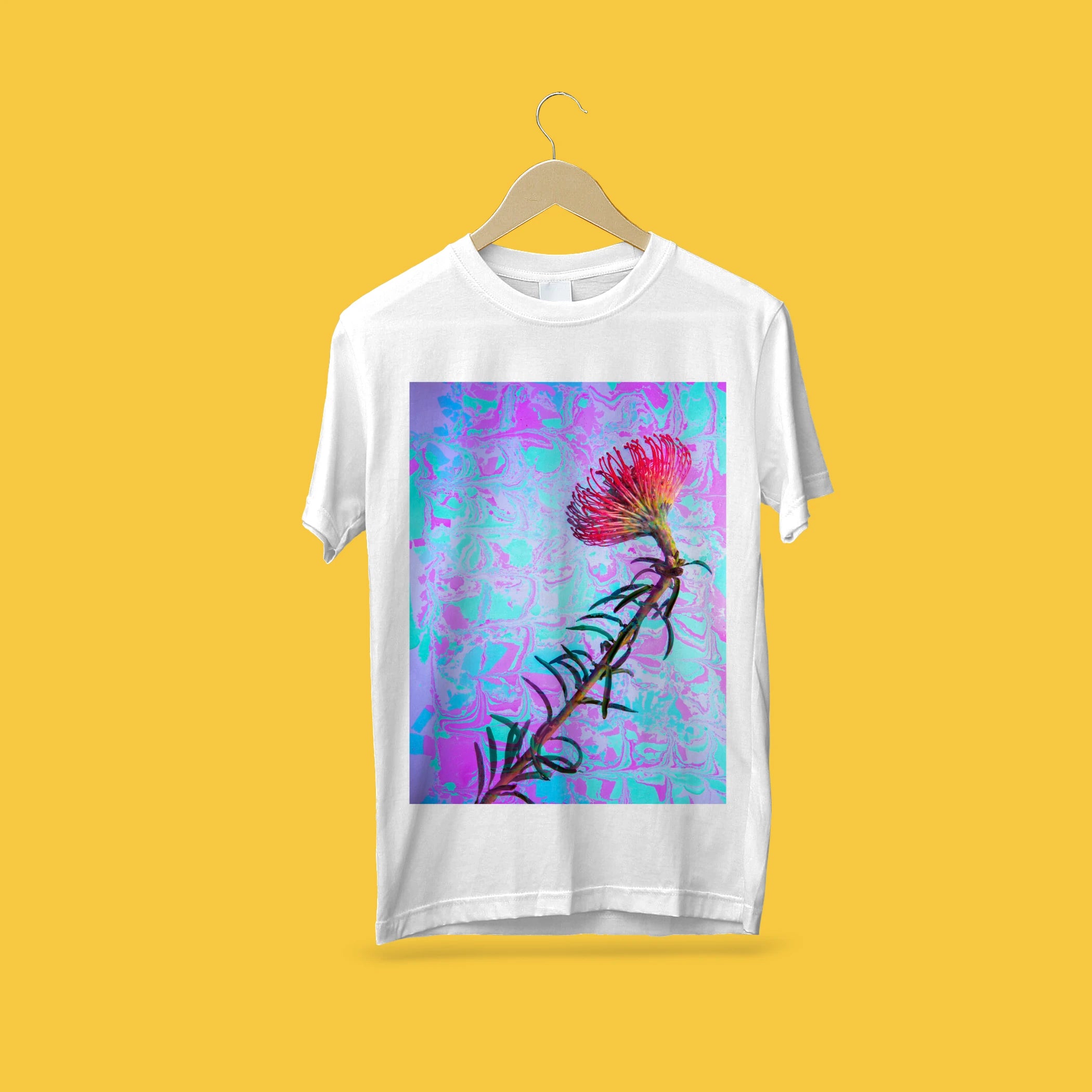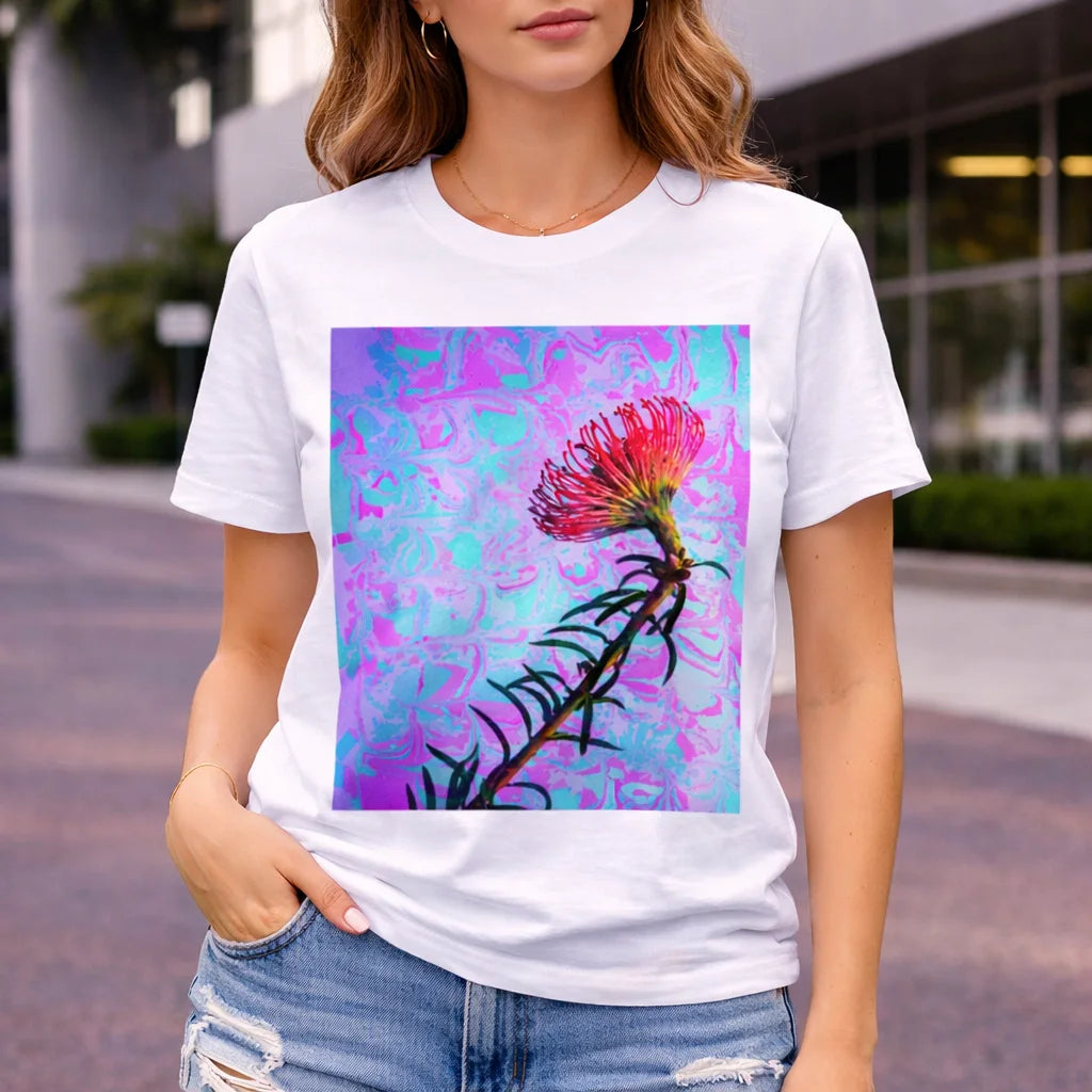 The Neon Bloom Graphic T-Shirt features a vibrant artistic flower design set against a dreamy abstract background of purple and aqua tones. The bold botanical element combined with fluid textures creates a striking visual balance between nature and digital art.